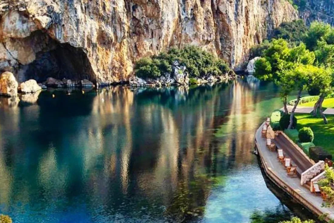 Lake Vouliagmeni, nestled in the Athenian Riviera, is one of Greece's 20 hot springs. Geologists believe it formed around 2,000 years ago when a cave roof collapsed. The lake holds a fascinating cave system, though it's off-limits to the public due to safety concerns. Remarkably, it's also the starting point for the world's longest underground tunnel, measuring 800 meters in length and reaching a depth of 80 meters. The lake's brackish water is continually refreshed by the sea and thermal springs, making it a geological wonder of global significance. The warm water, ranging from 21°C to 29°C, provides a natural thermal spa experience, renowned for its healing properties. The lake is well-known for its capacity to provide relief from rheumatic and gynecological issues, and it is an excellent place to relax and rejuvenate the body and spirit. Surrounded by imposing rock formations that change color throughout the day, the lake is an ideal spot to enjoy this romantic landscape. Visitors can appreciate this view from the lakeside coffee restaurant, which is open all day and into the evening.